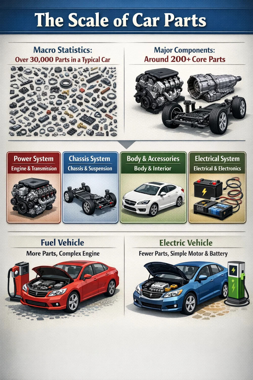 যদি আমরা একটি গাড়িকে তার ক্ষুদ্রতম উপাদানগুলিতে বিচ্ছিন্ন করি, প্রতিটি স্ক্রু, ওয়াশার এবং তারকে একটি পৃথক অংশ হিসাবে গণনা করি, একটি সাধারণ পারিবারিক গাড়ি সাধারণত হাজার হাজার অ-বিচ্ছিন্ন স্বতন্ত্র অটো যন্ত্রাংশ থেকে একত্রিত হয়। অত্যন্ত জটিল রেসিং কারগুলির জন্য, এই সংখ্যাটি দ্বিগুণও হতে পারে।