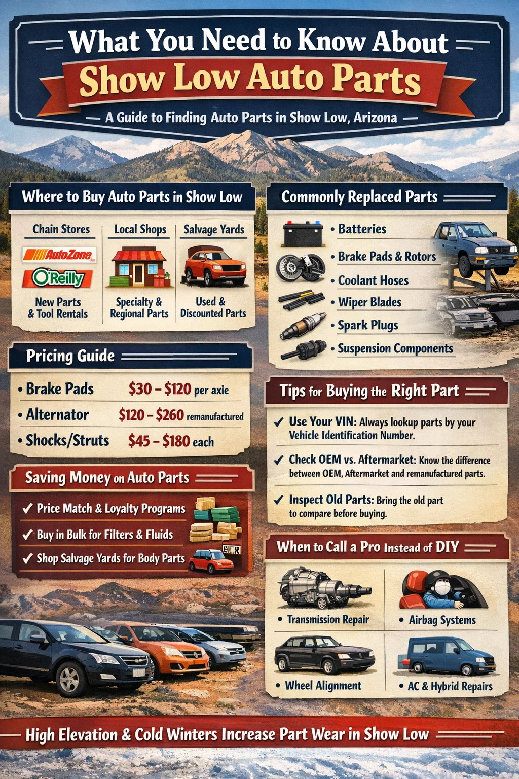 শো লো প্রায় 6,300 ফুট উচ্চতায় নাভাজো কাউন্টিতে বসে, এবং পর্বত জলবায়ু যানবাহনগুলিতে নির্দিষ্ট পরিধানের চাহিদা রাখে যা ফিনিক্স বা টুকসনের চালকরা কেবল মুখোমুখি হয় না। ঠাণ্ডা শুরু, শীতের ঝড়ের সময় রাস্তার লবণ এবং উচ্চ উচ্চতায় অতিবেগুনী এক্সপোজার সবই অংশের অবক্ষয়কে ত্বরান্বিত করে , বিশেষ করে রাবারের উপাদান, ব্যাটারি এবং ব্রেক সিস্টেমের জন্য। তার মানে এখানকার বাসিন্দারা জাতীয় গড়ের তুলনায় নির্দিষ্ট অটোমোবাইল যন্ত্রাংশ প্রতিস্থাপন করে।