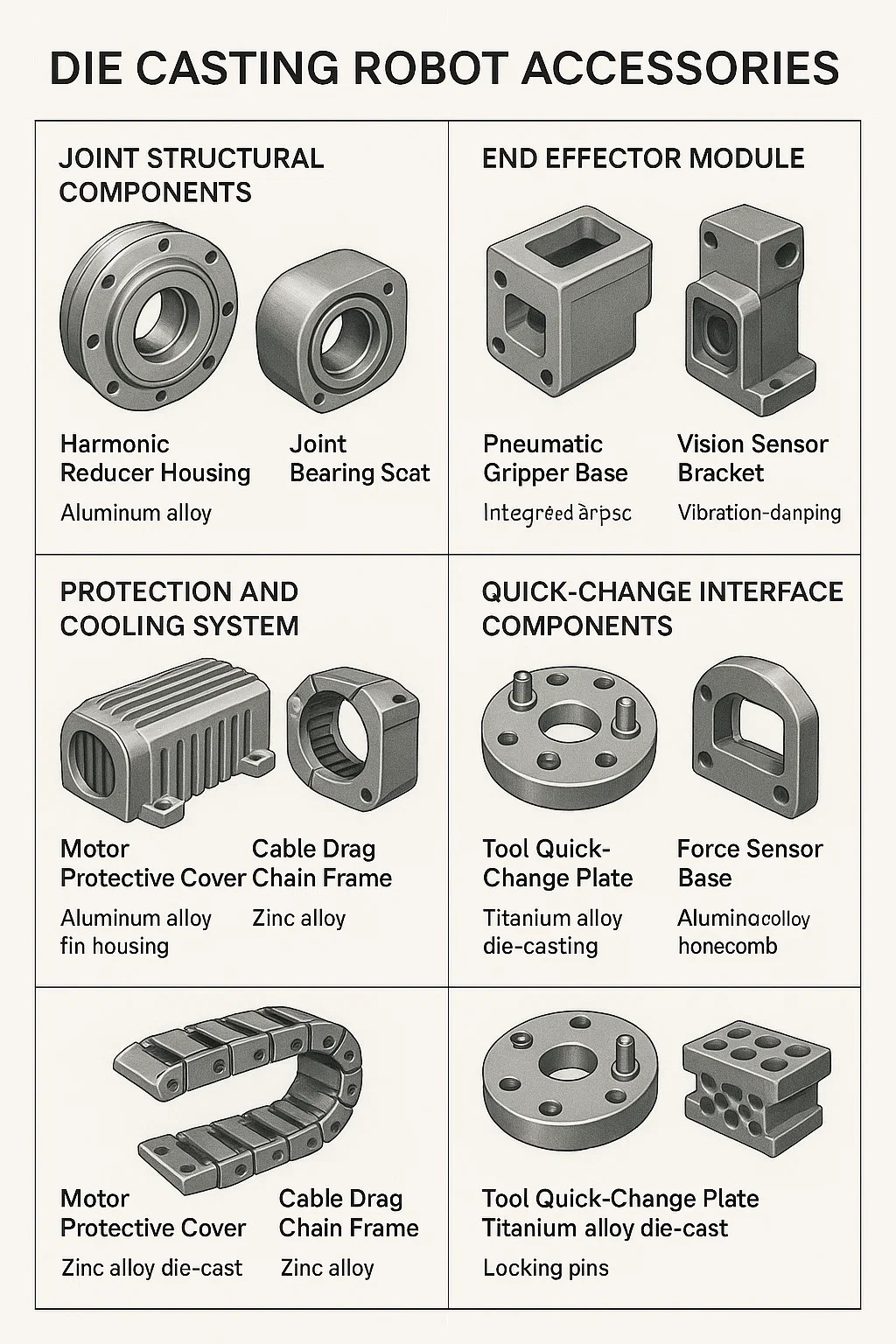 কাস্টিং রোবট আনুষাঙ্গিকগুলি মারা যান একটি উচ্চ-চাপ কাস্টিং প্রক্রিয়া মাধ্যমে উত্পাদিত মূল ধাতব উপাদান। তারা যথার্থতা, লাইটওয়েটিং এবং স্থায়িত্ব সহ শিল্প রোবটগুলির মূল প্রয়োজনীয়তাগুলিকে সম্বোধন করে। মূল অ্যাপ্লিকেশন এবং বৈশিষ্ট্যগুলি নিম্নরূপ: