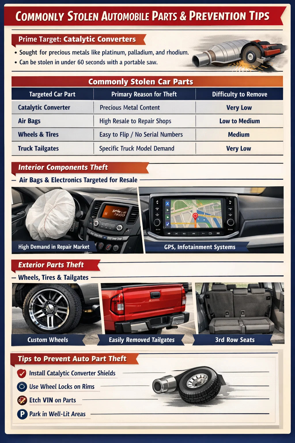 চোরেরা সাধারণত ফোকাস করে অটোমোবাইল অংশ যেগুলি সরানো সহজ এবং ট্রেস করা কঠিন। নিম্নলিখিত সারণীটি সবচেয়ে সাধারণ লক্ষ্যগুলি এবং কেন সেগুলি চুরি করা হয় তা হাইলাইট করে৷