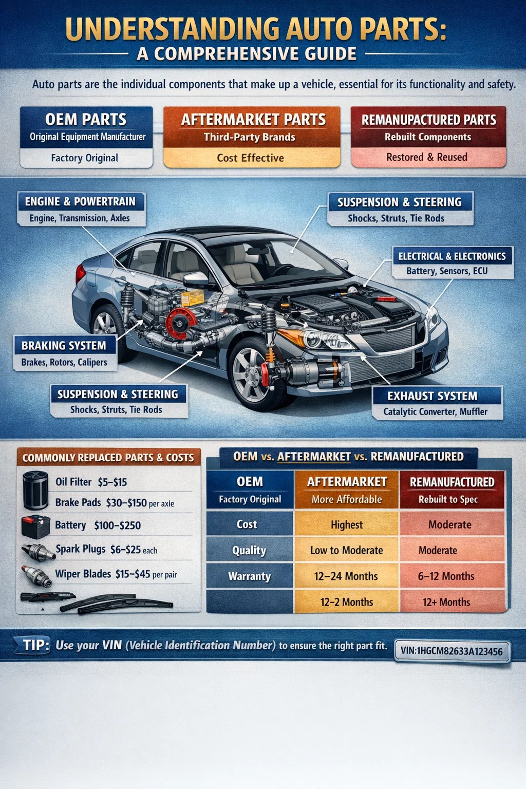 একটি স্বয়ংক্রিয় অংশ — যাকে গাড়ির অংশ বা যানবাহনের উপাদানও বলা হয় — যে কোনও পৃথক অংশ, সমাবেশ বা সিস্টেম যা একটি মোটর গাড়ি তৈরি করে। প্রতিটি গাড়ি, ট্রাক, বা SUV হাজার হাজার স্বতন্ত্র অটো পার্টস থেকে তৈরি করা হয়েছে, প্রতিটিতে একটি নির্দিষ্ট ফাংশন রয়েছে যা গাড়িটি কীভাবে শুরু হয়, চলে, থামে, স্টিয়ার করে এবং এর যাত্রীদের নিরাপদ এবং আরামদায়ক রাখে। অটো যন্ত্রাংশ সঠিকভাবে কাজ না করলে, একটি যানবাহন নির্ভরযোগ্য বা নিরাপদে চলতে পারে না।