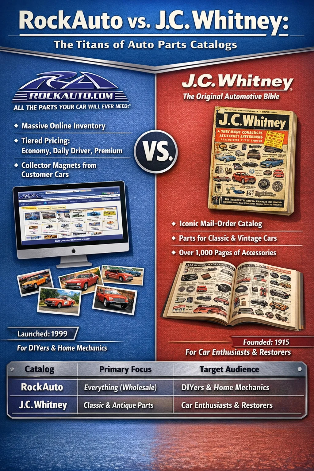 লোকেরা যখন সবচেয়ে বিখ্যাত অটো পার্টস ক্যাটালগ সম্পর্কে জিজ্ঞাসা করে, তখন দুটি নাম কথোপকথনে আধিপত্য বিস্তার করে: রকঅটো ডিজিটাল যুগের জন্য এবং জে সি হুইটনি ঐতিহাসিক গুরুত্বের জন্য। রকঅটো আধুনিক গোল্ড স্ট্যান্ডার্ড হয়ে উঠেছে, একটি সম্পূর্ণ অনলাইন ডাটাবেস অফার করে যা প্রায় প্রতিটিকে কভার করে অটোমোবাইল অংশ গত কয়েক দশকে নির্মিত। যারা মেইল-অর্ডার পেপার ক্যাটালগের যুগের কথা মনে রাখেন, J.C. Whitney ছিলেন অবিসংবাদিত রাজা, যিনি স্বয়ংচালিত DIY জগতের "বাইবেল" নামে পরিচিত।
